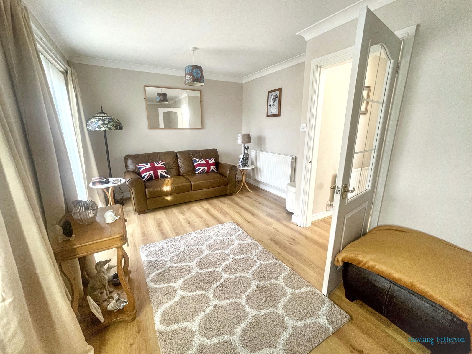 Stairs off to the first floor with understairs store cupboard, laminate flooring and part glazed door to;