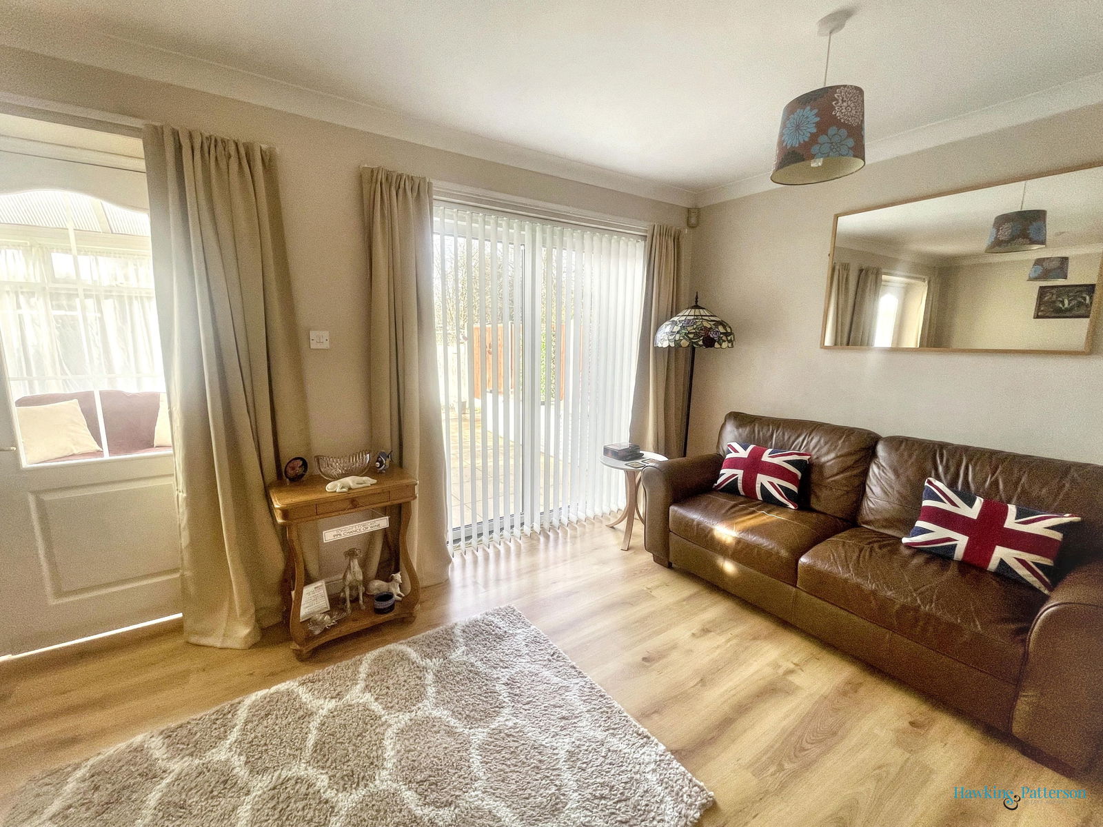 Coving to ceiling, radiator, laminate flooring, double glazed sliding patio doors to the garden and double part glazed doors to;