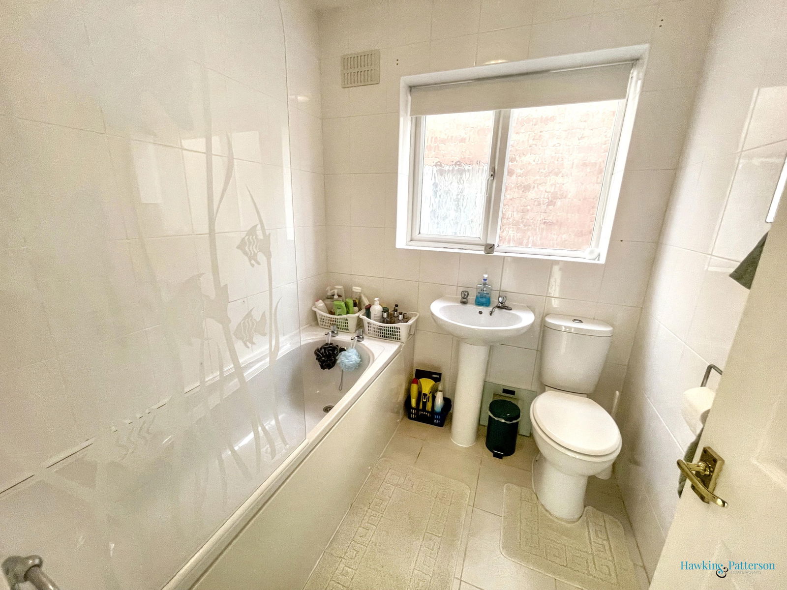 White suite with pedestal wash basin, WC, panelled bath with electric shower over, tiled walls and flooring, chromed heated towel rail and obscured double glazed window to side.