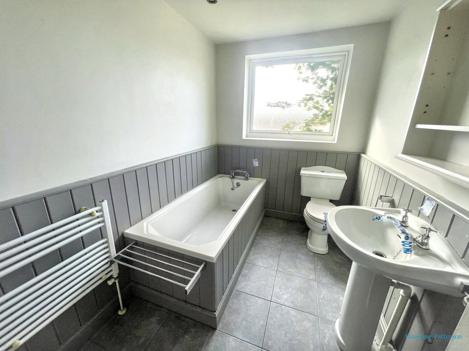 Double glazed frosted window to side, white WC and wash basin, wood panelling, radiator and tiled floor.