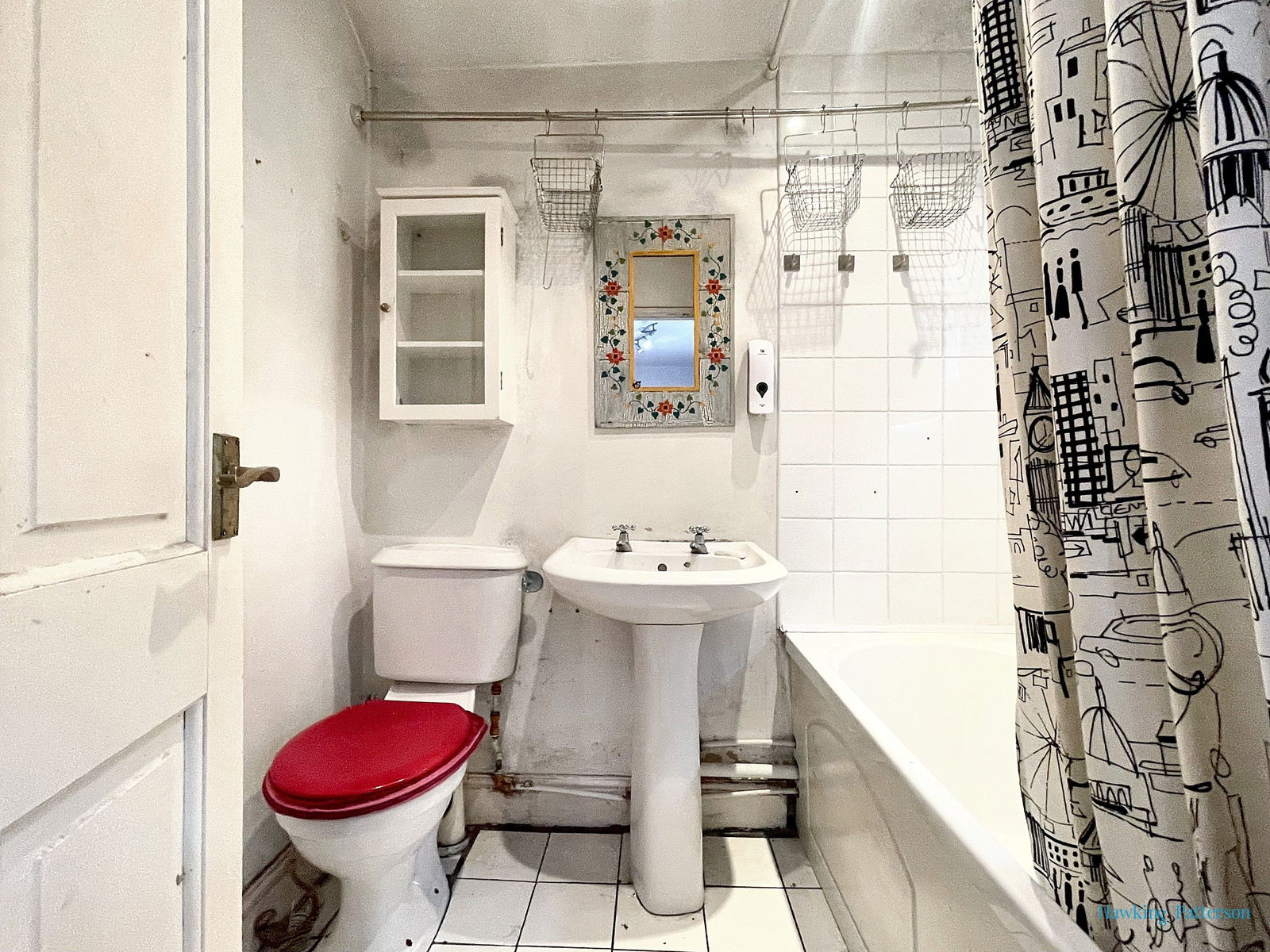 White WC, pedestal wash basin, panelled bath with mixer tap and shower attachment, double glazed window to side, tiled floor.