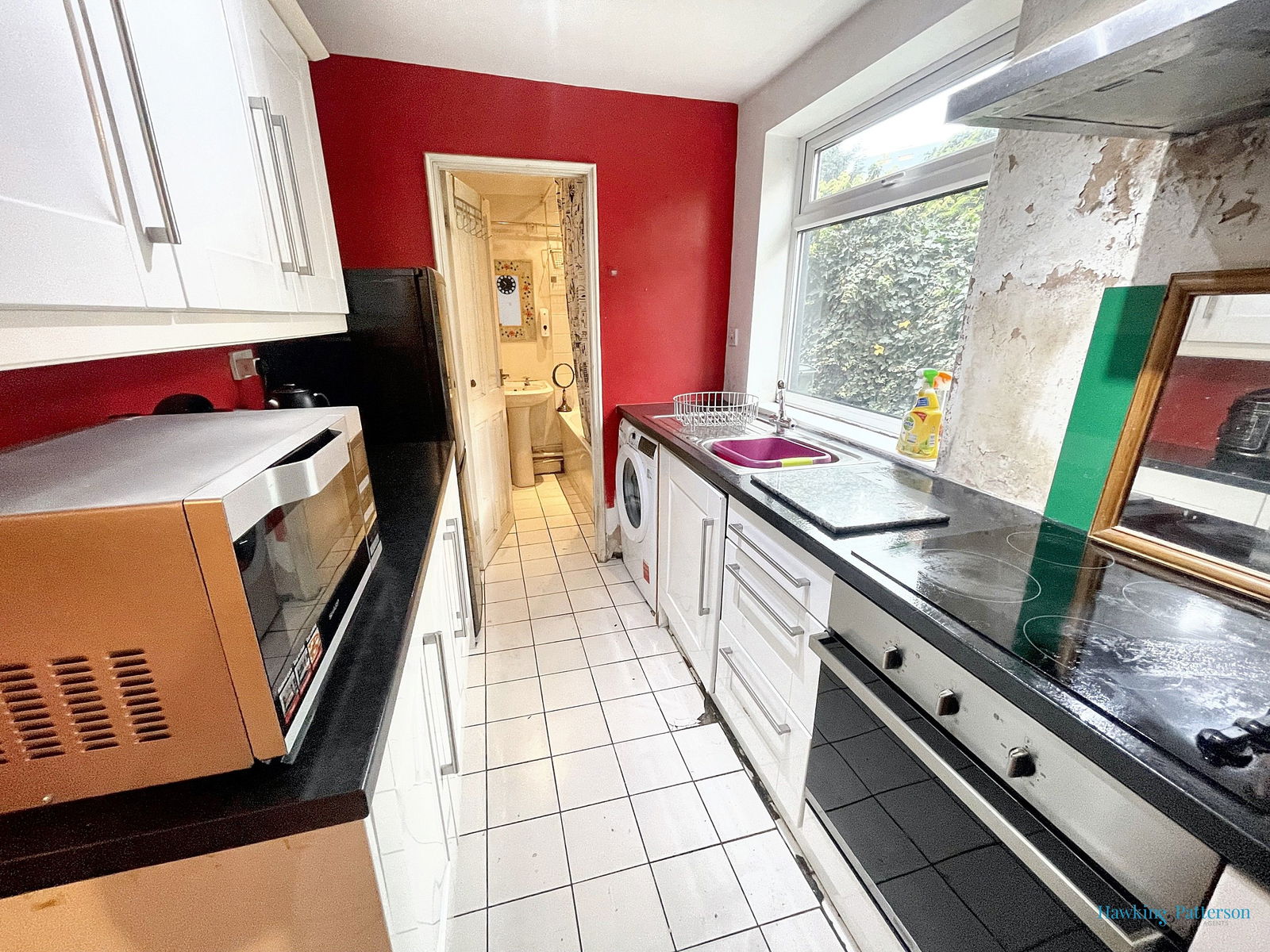 Double glazed window to side, fitted base, wall and drawer units, roll top work surfaces, wall mounted Worcester Bosch combination boiler (installed April 2024). Built in electric oven, four ring hob, plumbing for washing machine, tiled floor, space for fridge freezer and door to bathroom.