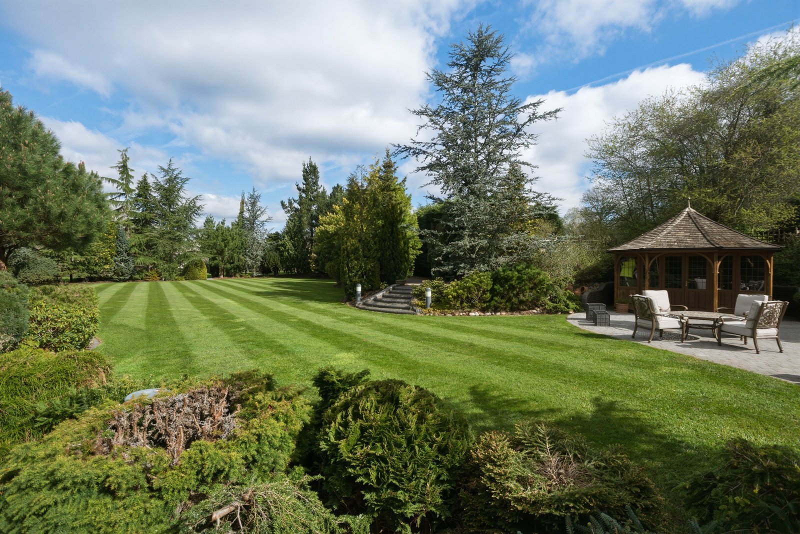 This beautifully presented rear garden boasts a neatly maintained lawn with lush, vibrant greenery, complemented by established shrubs, evergreens, and mature trees that create a private and tranquil setting. An app-controlled irrigation system and lighting all around the garden enhances both convenience and ambiance throughout the space.