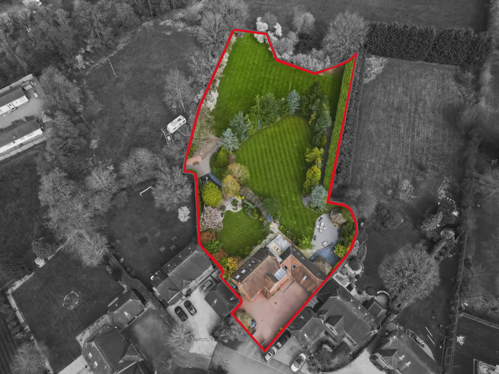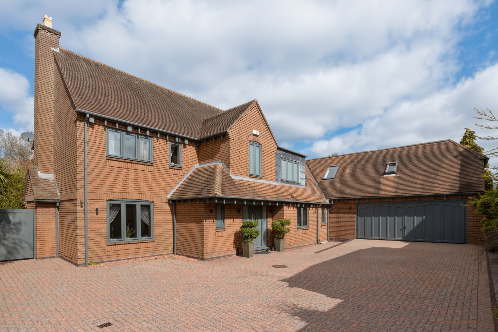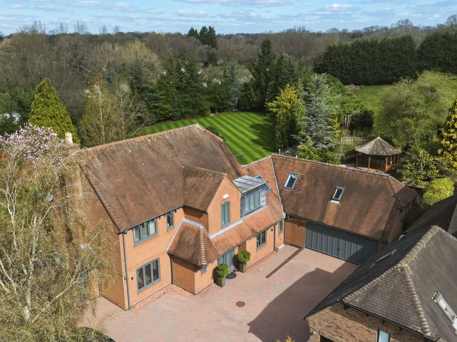 A striking feature walkway, complete with slate paving and an elegant arched pergola with integrated lighting, adds character and charm.