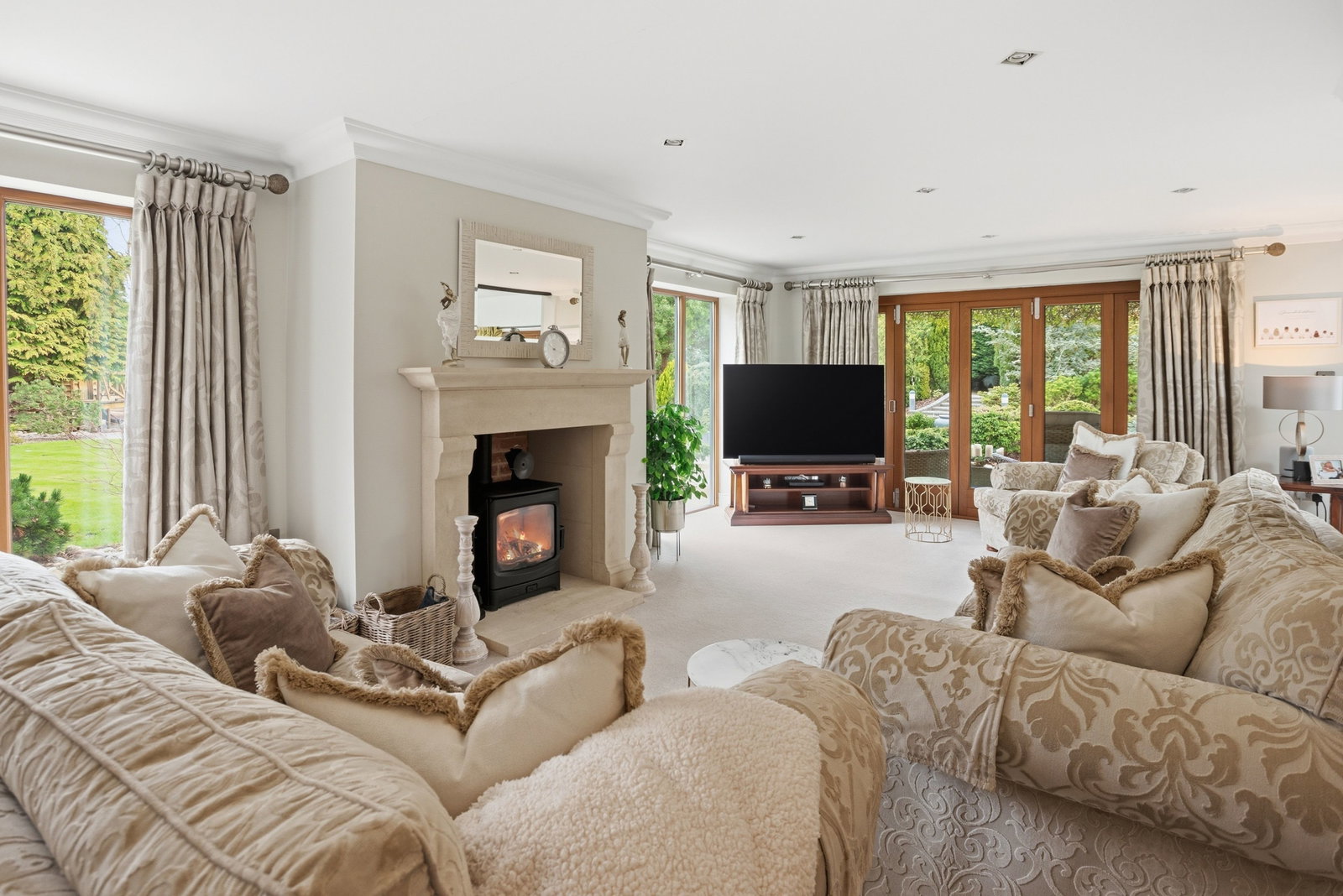 Feature Bath stone fireplace with log burner, underfloor heating to the extended part, Two double glazed floor to ceiling windows overlooking the rear garden, radiator with decorative cover, coved cornice, Double glazed Bi-fold doors to a covered seating area with power for hot tub if desired . Industrial style, sliding doors to;