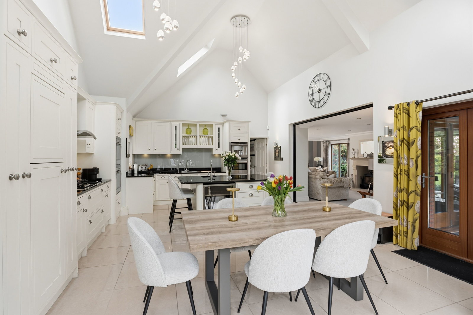 A bespoke kitchen with an extensive range of base, wall and drawer units, granite work tops, sink drainer with Quooker tap, integrated dishwasher, two Neff built in ovens, five ring gas hob with extractor over, microwave and coffee machine and integrated larder fridge. Tiled flooring with underfloor heating, Feature, high vaulted ceiling with electronically operated Velux window lights (app control) with rain close sensors, Bi-fold doors to the patio, app controlled lighting. Centre island breakfast bar with base units, wine fridge and granite work tops incorporating a sink drainer.