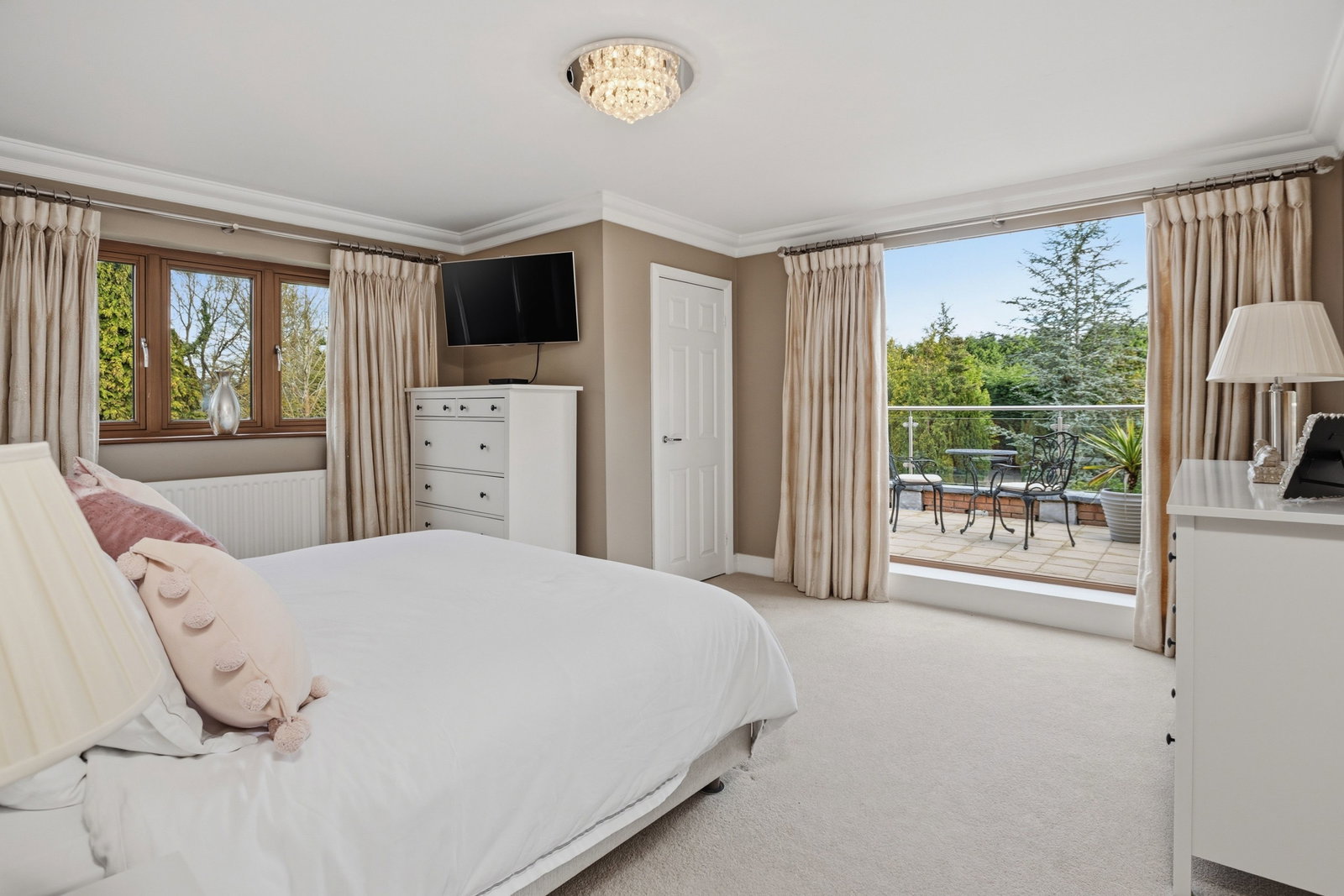 App controlled lighting, coved cornice, built in wardrobe, radiator, double glazed window to rear, door to dressing room, ensuite and double glazed doors to;
