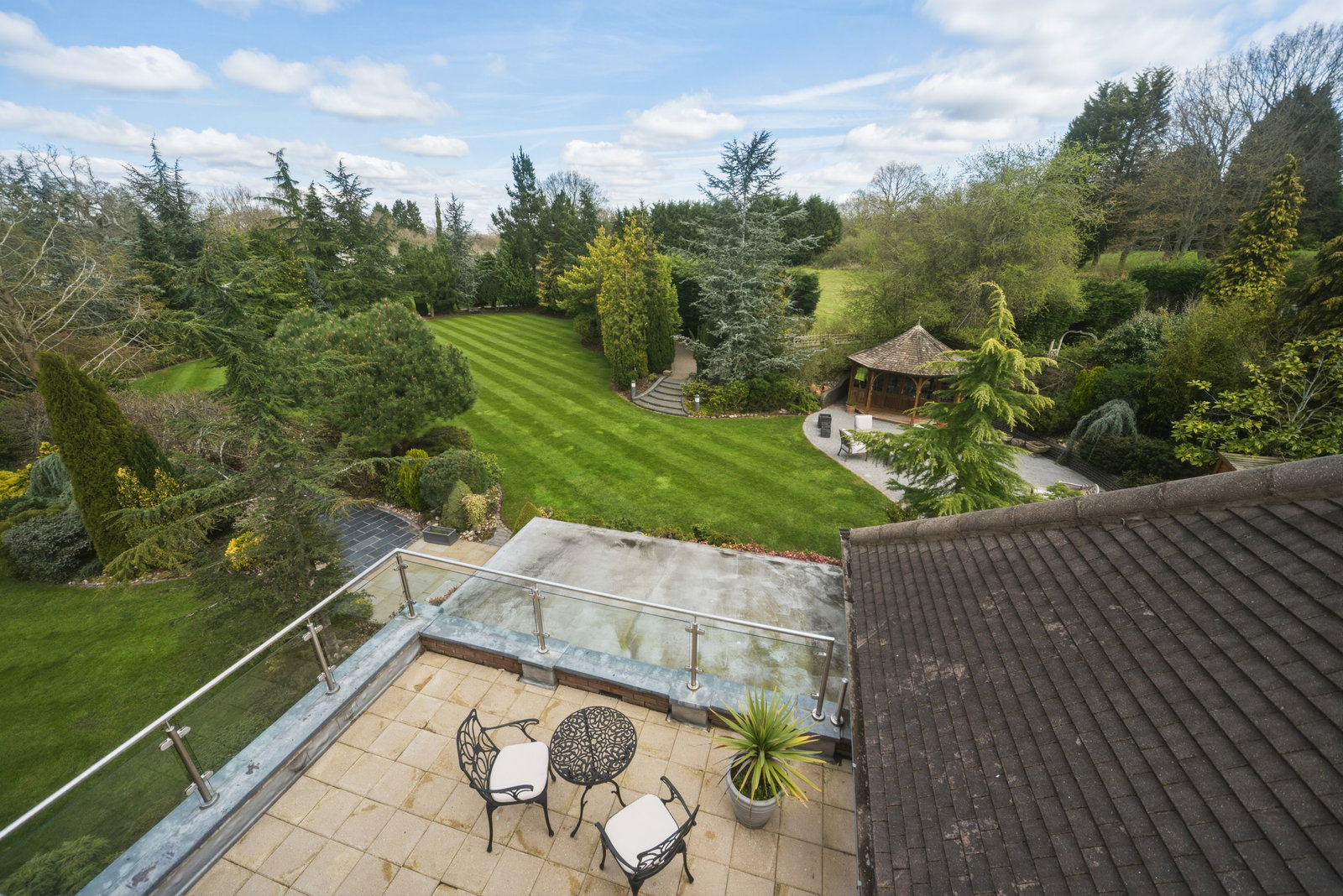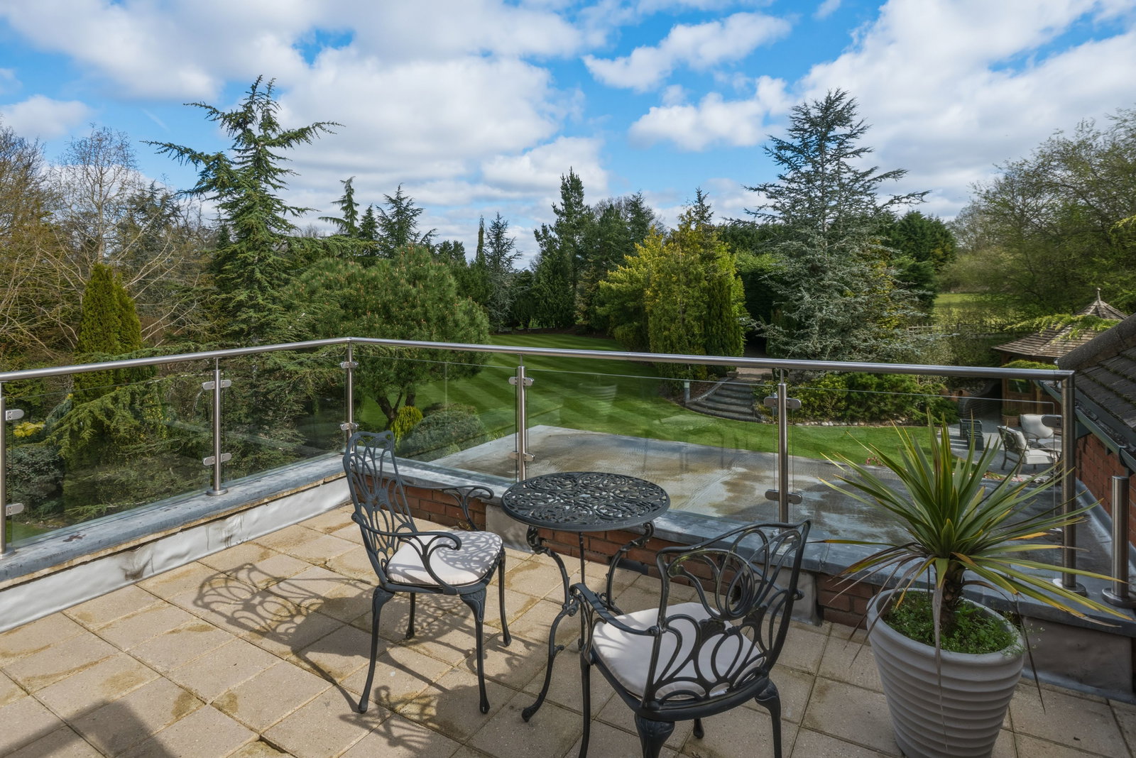 Paved base, external lighting, post and rail glass balustrade with amazing views over the rear garden.