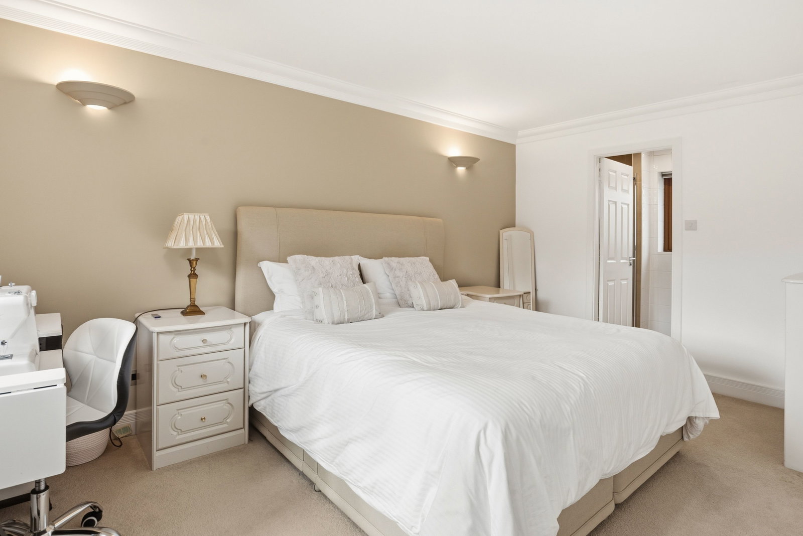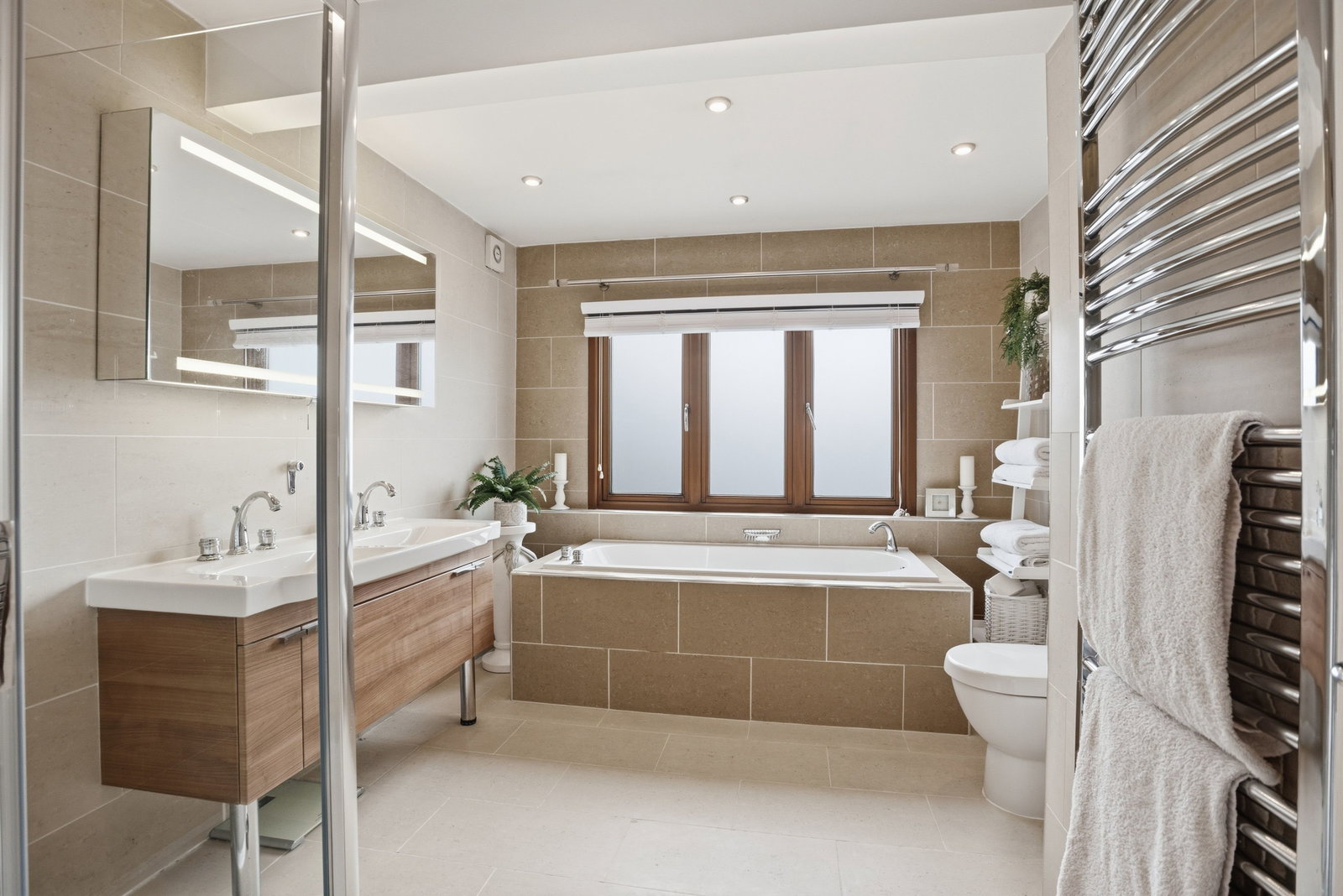 Beautifully tiled walls and flooring, extractor fan, chromed heated towel rail, LED downlights, frosted double glazed window to front. White bathroom suite, WC , wide bath, his and hers wash basins with storage beneath, oversized shower cubicle with Grohe shower.