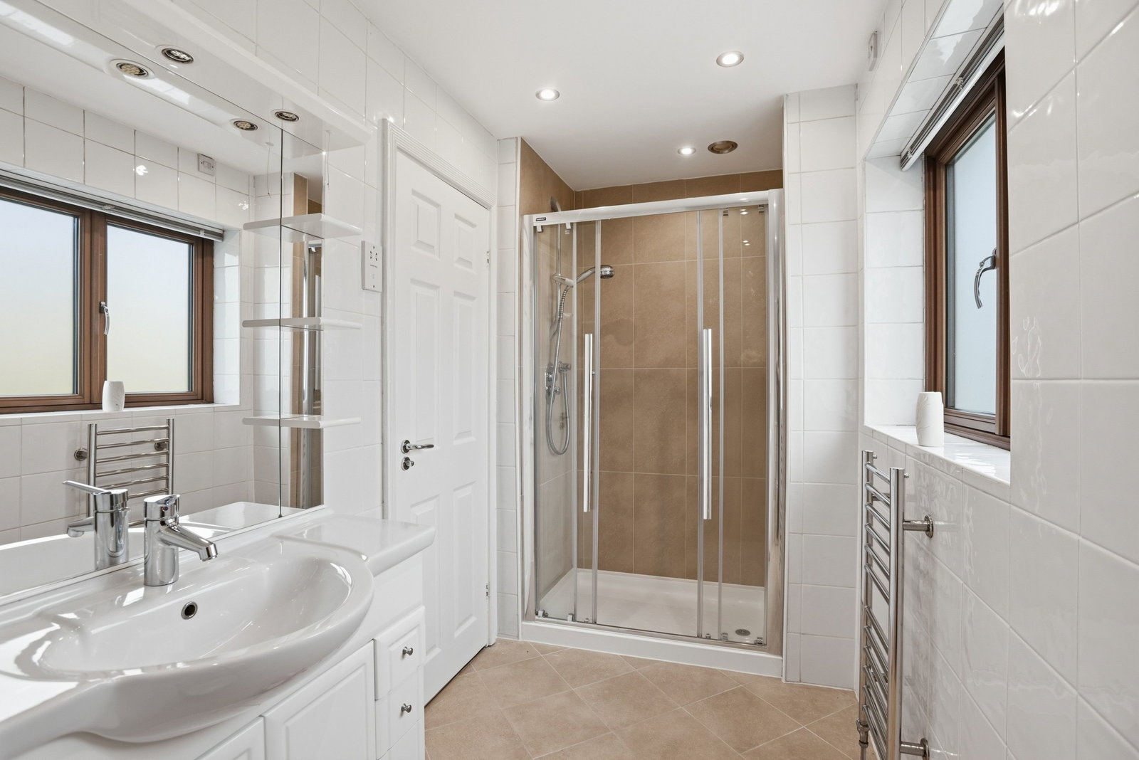 Frosted double glazed window to rear, extractor fan, chromed heated towel rail, fully tiled walls and flooring. Built in vanity units, WC, wash basin, double shower cubicle with Grohe shower.