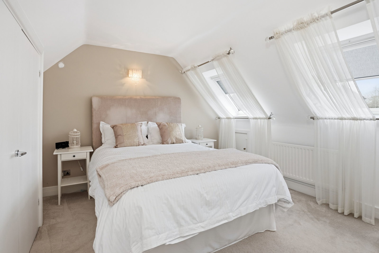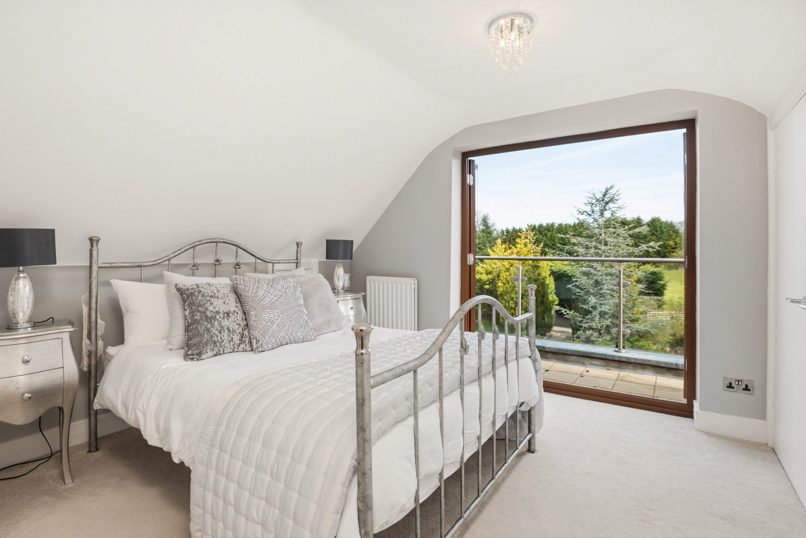Two double wardrobes, radiator, storage into the eaves, door to ensuite and double glazed doors to;