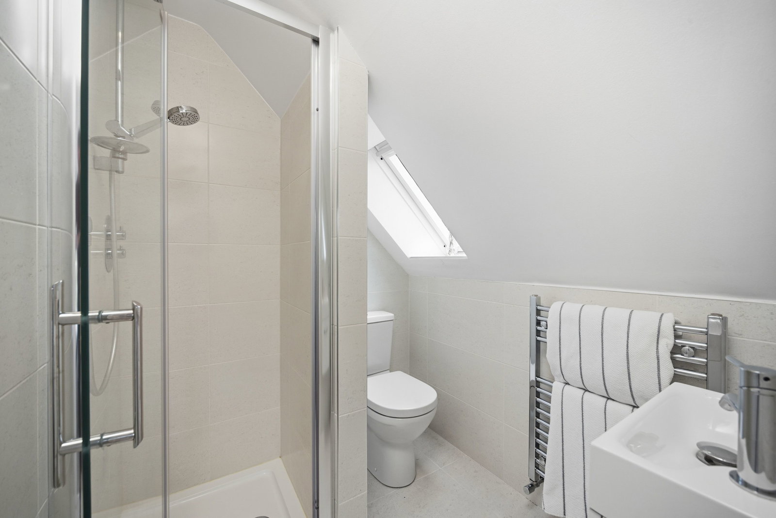 Feature tiled walls and flooring, chromed heated towel rail, double glazed velux window. White suite, WC, wash basin and shower cubicle with Methven shower.