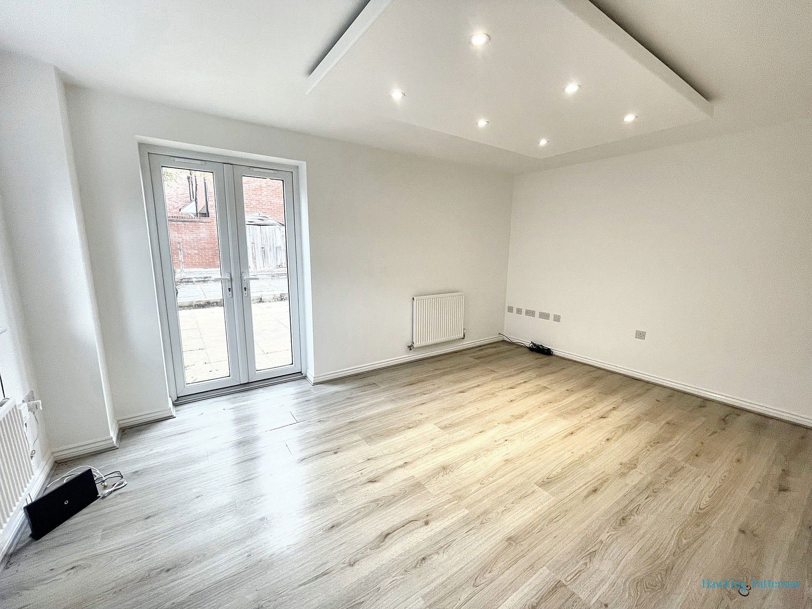 A bright, well proportioned room with a front window plus patio doors on the side out to the garden.