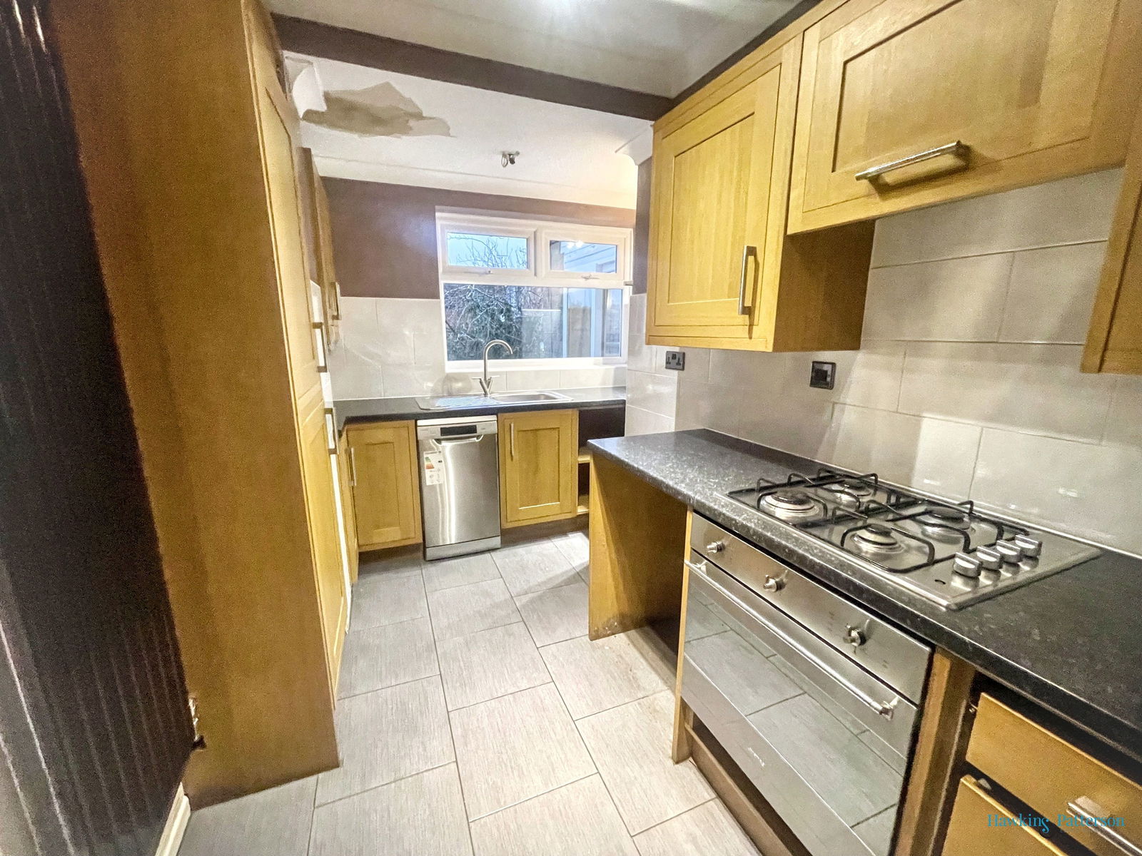 Fitted solid wood fronted, base, wall and drawer units, roll top worksurfaces, tiled splashbacks, built in electric Smeg oven, four gas ring hob and extractor over, sink drainer, plumbing for dishwasher and space for fridge/ freezer, cupboard housing the Vaillant central heating boiler. Double glazed window overlooking the rear garden and door to;