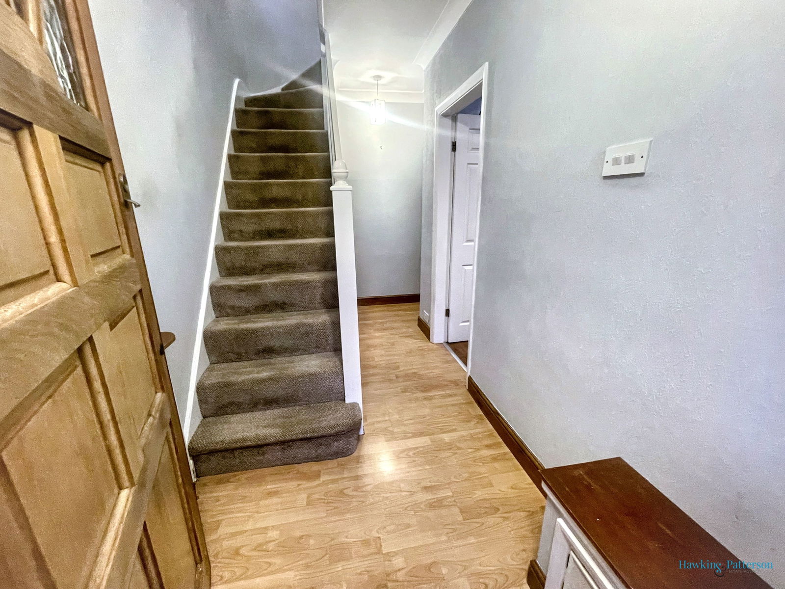 Stairs off to the first floor, radiator, understairs storage cupboard, laminate flooring and doors to;