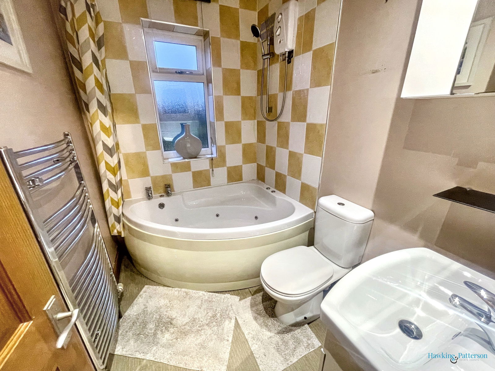 Corner bath with shower over, WC, vanity unit and wash basin, chromed heated towel rail, ,tiled splashbacks and frosted double glazed window to front.