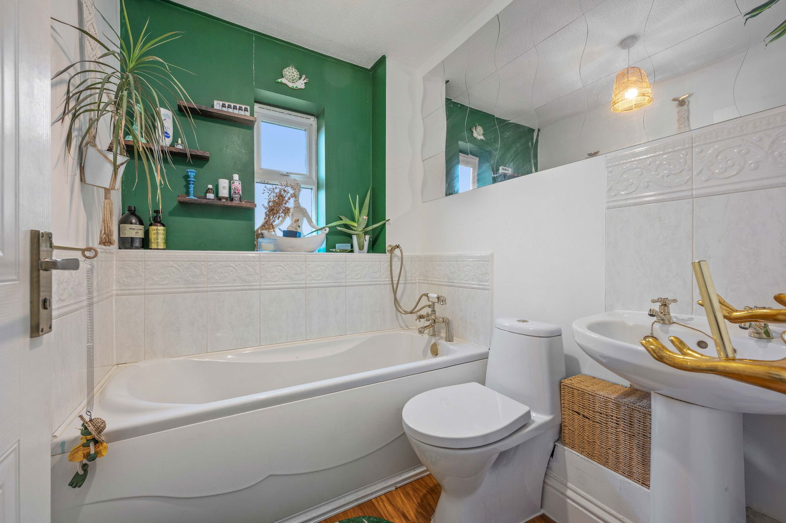 With a white suite providing, bath with ornate mixer tap & hand held shower. Duel flush WC & wash basin. Laminate flooring.