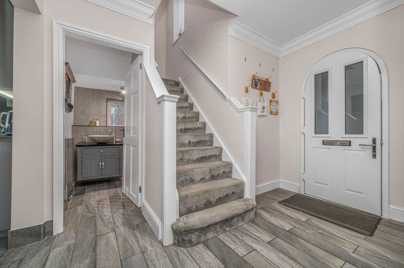 Stairs off to the first floor, Herringbone pattern tiled floor , radiator and coved cornice..