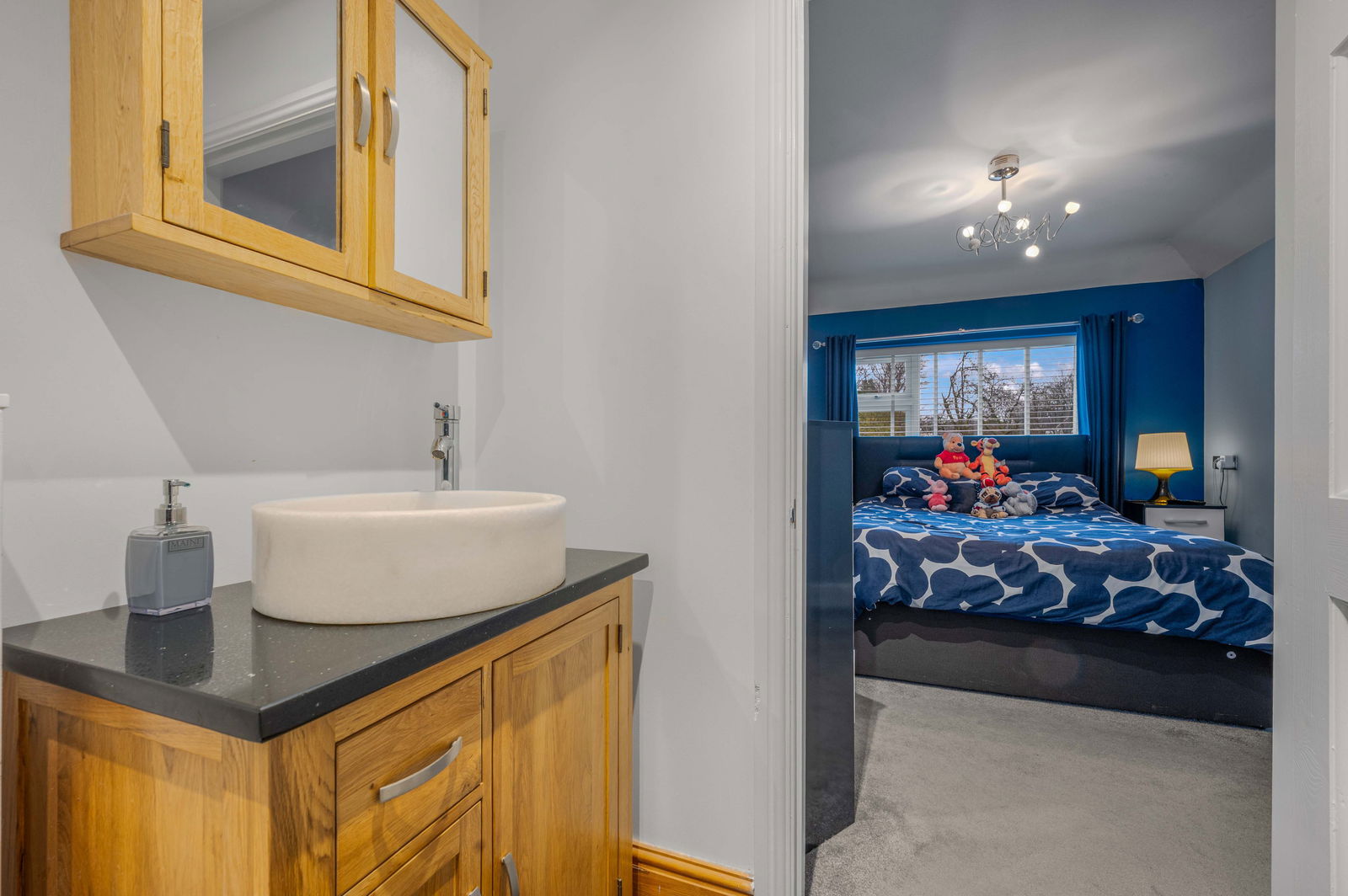 Beautifully appointed with a modern white suite. WC, Jacuzzi bath, wooden vanity unit with his and hers countertop oval wash basins, obscured double glazed window and chromed heated towel rail.