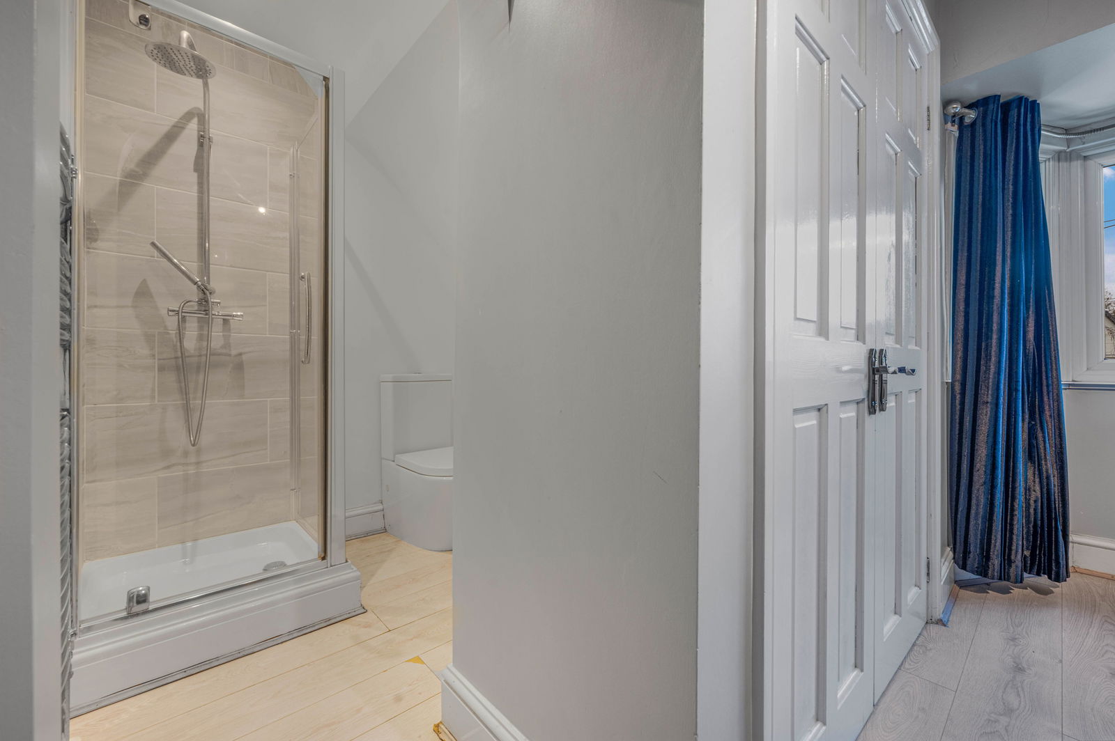 Modern white suite with WC, pedestal wash basin, corner shower cubicle with thermostatic shower and separate spray attachment, ceiling downlights, feature tiled splashbacks and chromed heated towel rail.