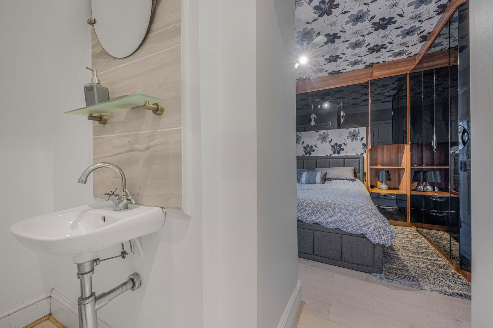 Coved cornice to ceiling, double glazed bay window to front, built in window seat and storage, radiator and feature Soho collection, steel look doors into;