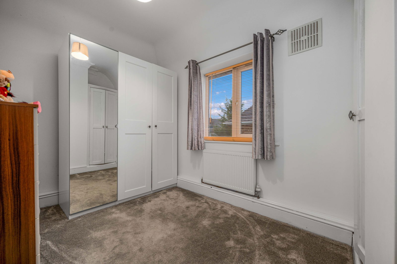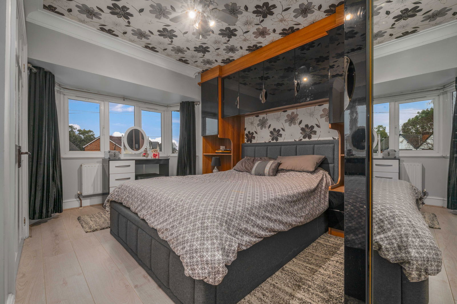 Double glazed bay window to front, radiator, fitted bedroom suite of ample wardrobes, drawer and bedside cabinets with storage cupboards over the bed space. Additional built in wardrobe and door to