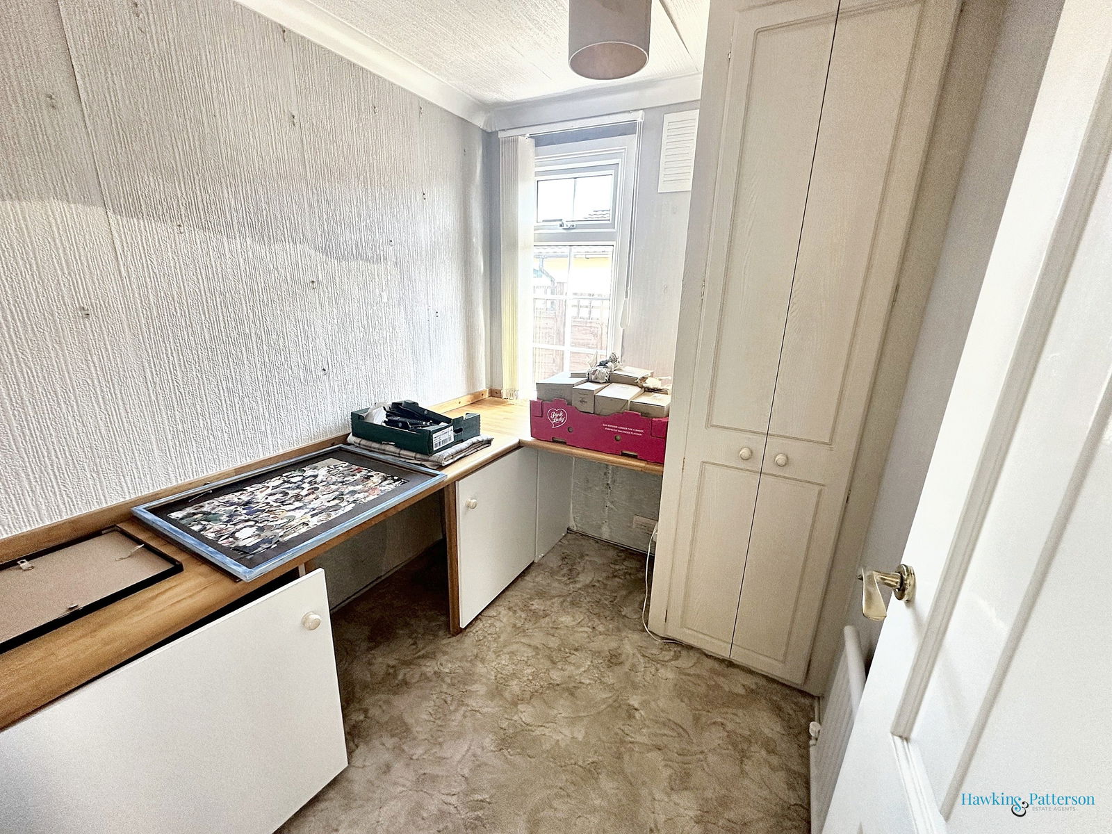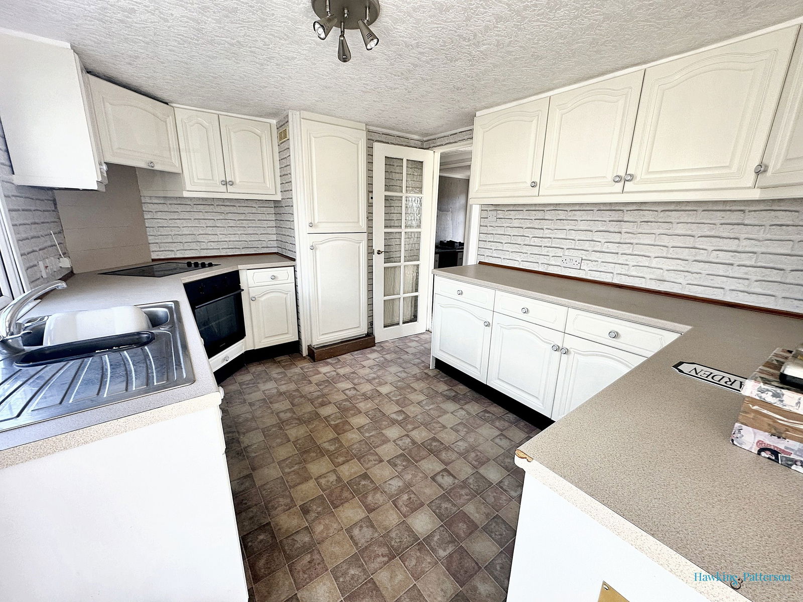 Fully fitted with base cupboards & drawer under contrasting worktops. Sink & drainer below side window. Inset halogen hob with electric oven below. Space for under top fridge. Full range of wall cupboards. Full height cupboard housing floor standing Oil fired boiler.