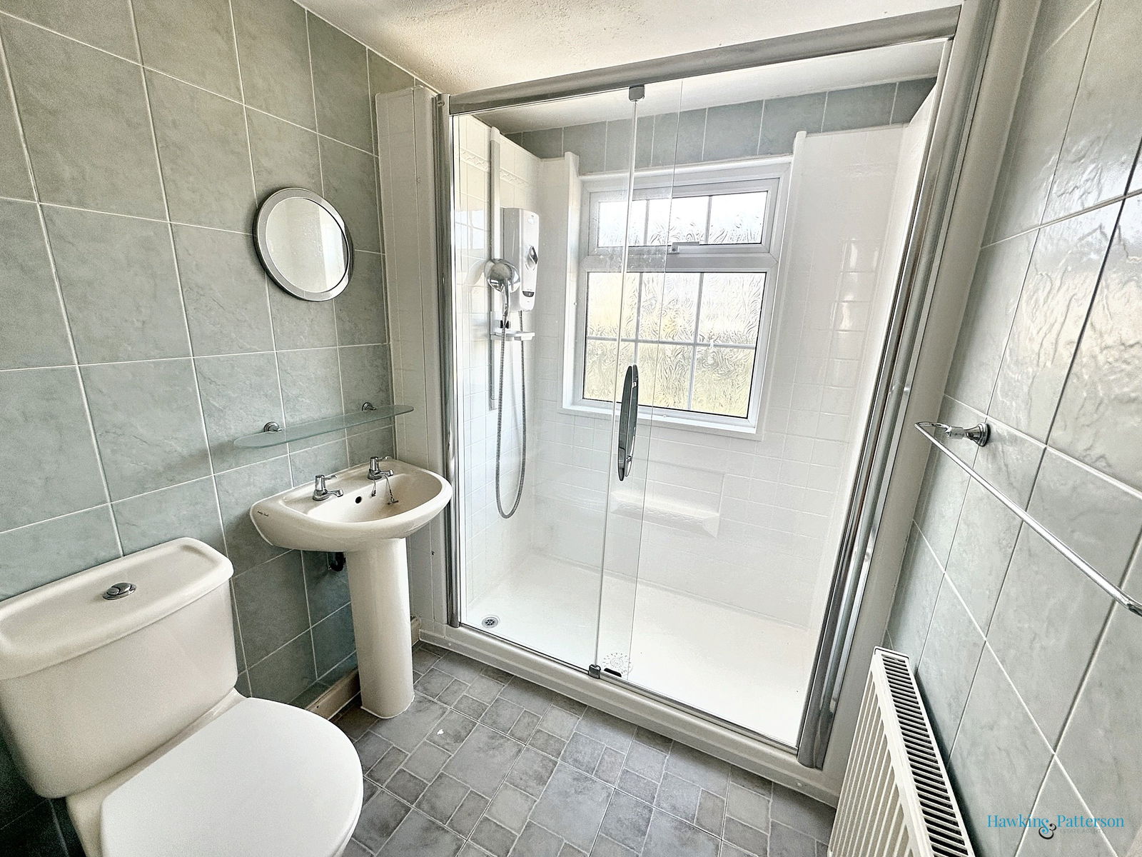 Full width shower with glass side & matching sliding door. Wash basin & dual flush WC. Obscure glazed side window.